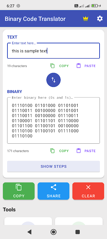 • Kopyala, Paylaş ve Değiştir — Metin veya ikili çıktıyı panoya kopyalayın, sonuçları diğer uygulamalarla paylaşın ve tek dokunuşla giriş/çıkış alanlarını değiştirin.