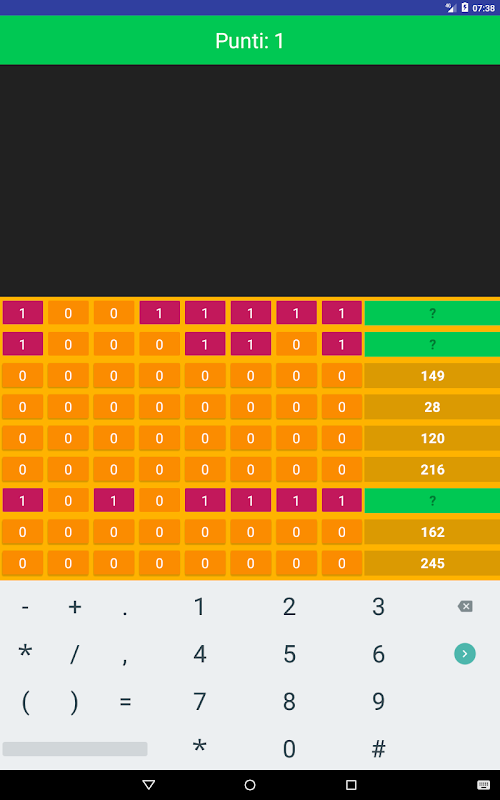Uygulama bit seçimi ondalık gösterilen sayı veya ikili dizi önerisine uygun ondalık sayı tersine, yazmaya corrispodenti gerektirir. Onların ekranın üst ulaşmadan önce (her 5 saniyede eklenir) dönüşümlerini cevap vermek zorunda.