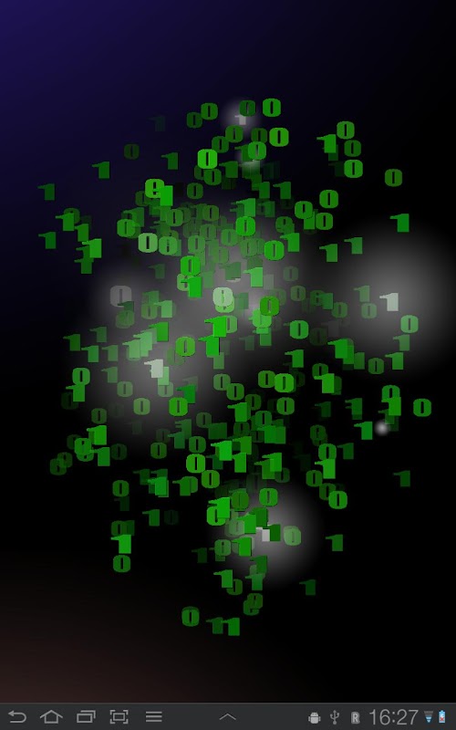 A tree with ones and zeros as leaves. Branches sway slowly and the tree spins smoothly around it's own axis as you scroll between home screens. Tree branches die after a while and fade away, and a new branch is born, growing up from the trunk led by a glowing cursor. As the branch is fully grown it explodes in a light flash and leaves a new 1 or 0 as the leaf.