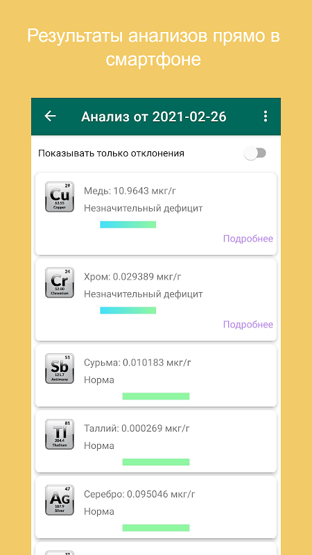Просматривайте результаты, описания элементов, время записи прямо в приложении.