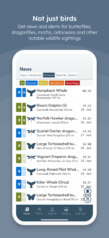 • YENİ - Görünür yarıçap ayarı gibi gelişmiş seçeneklere sahip uyarı filtreleri, nadirlik düzeyi veya belirli yaban hayatı türleri veya türleri ile birleştiğinde ilginizi çeken herhangi bir haber iletildiğinde anında uyarılmanızı sağlar