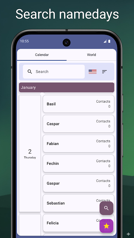 - Özelleştirilebilir widget'lar: Basit bir takvimde bugünün ve yarının isim günlerini, yaklaşan etkinlikleri veya isim günlerinin aylık genel görünümünü görüntülemek için ana ekranınıza widget'lar ekleyin. Görünümü kendi arka planınız ve metin renklerinizle özelleştirin.