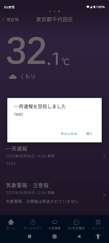 - Tüm ülke, mevcut konum ve kayıtlı alanlar için afet önleme ve hava durumu bilgilerinin yanı sıra Biz Safety'den gelen bildirimleri zaman çizelgesi formatında görüntüler.