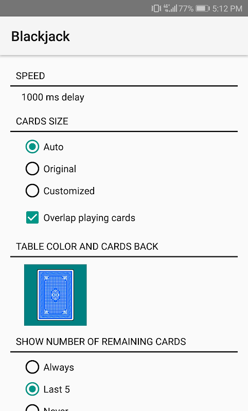 - Ayarlar: Kart boyutu, kartların arka rengi, ses, animasyonlar, hız, skor tablosu, masa ve puan rengi...