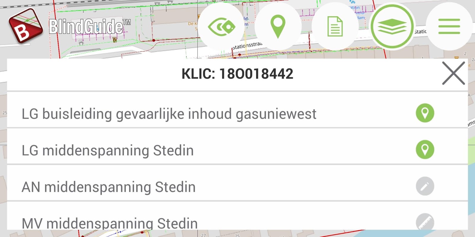 With the BlindGuide App, you can view geospatial information from drawings (such as Dutch Klic reports). In the screen, the user sees the map and his GPS position and the cables and ducts that should lie on that position projected on the drawings.