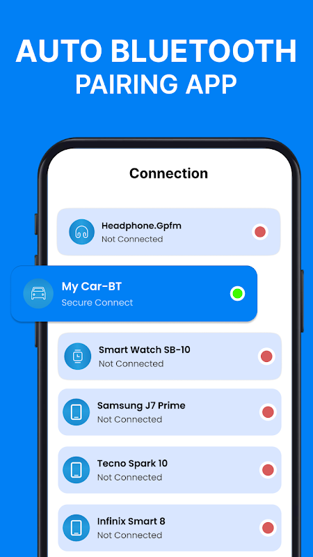 Ücretsiz Bluetooth Auto Connect - Connect Any BT Devices uygulamasını hemen indirin ve bluetooth kulaklık, bluetooth klavye, bluetooth hoparlör ve diğerleri gibi cihazlarla bağlantı sorunlarını unutabilirsiniz. Ayrıca, bt otomatik bağlantı için sık kullanılan cihazları da yapılandırabilirsiniz. Bluetooth otomatik bağlantı, seri işlevsellik sağlar, asıl olan Bluetooth bağlantısını taramak ve eşleştirmek ve bir Bluetooth bulucu olarak iyi bir sinyal bağlantısı kurmaktır. Şimdi herhangi bir Bluetooth uygulama cihazını çok kolay bir şekilde bağlayın, uygulamamızla taramaya başlayın ve çeşitli alanlarda sorunsuz bir şekilde bir cihazı eşleştirin. Uygulama, son bağlanan cihazı android telefonunuzla otomatik olarak eşleştirir, ayrıca eşleştirilen cihazı bağlantı kesme seçeneğiyle de değiştirebilirsiniz.
