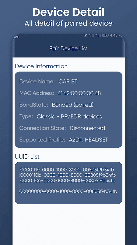 Bluetooth finder app display a list of all paired device, from which you can easily connect to a specified device and also un-pair any device. Bluetooth finder app will give all information of any paired device including its profile.