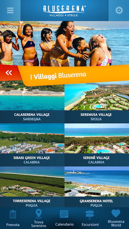 Durante la tua vacanza nei nostri villaggi avrai sempre con te il calendario delle attività del giorno, potrai conoscere la posizione in villaggio dei bambini del Serenino e del SereninoPiù, potrai consultare il catalogo delle escursioni e potrai accedere ai giochi di “Bluserena World”.