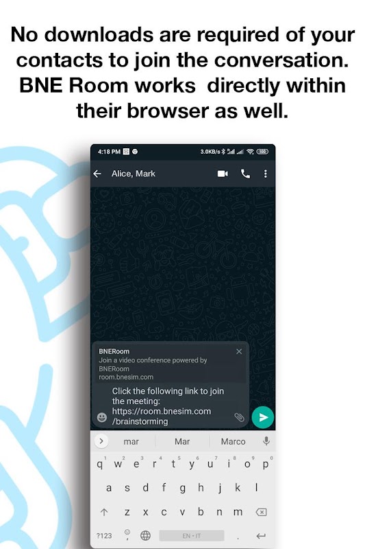 - No downloads are required of your friends to join the conversation. BNE Room works directly within their browser as well. Simply share your mnemonic conference URL with others to get started.