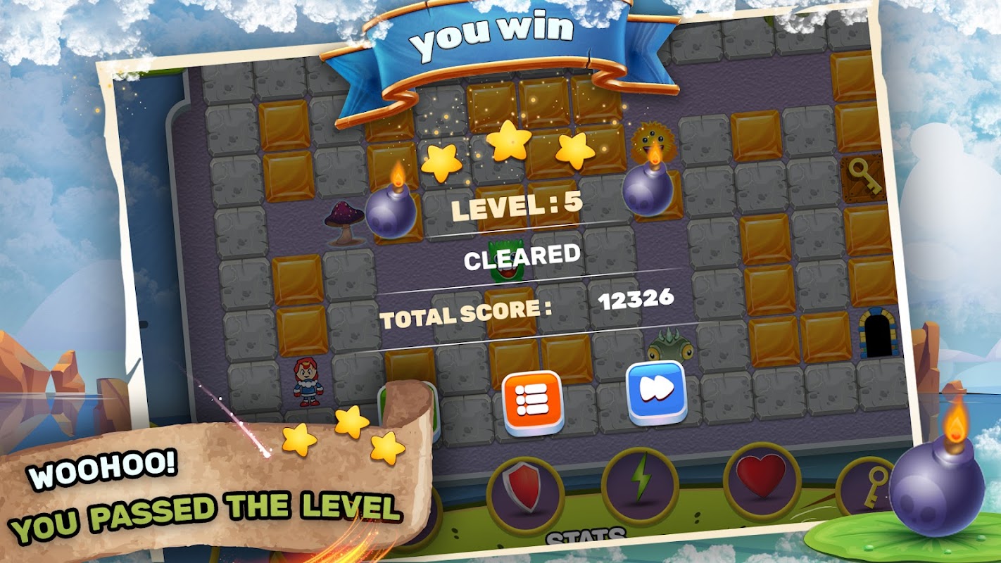 • Oyunun ana ekranına oyuncunun kazanması için zorluk yaratan iki tür blok yerleştirilmiştir. Bazı bloklar yok edilebilir ve bomba tarafından kolayca yok edilirken, bazı bloklar yok edilemez.