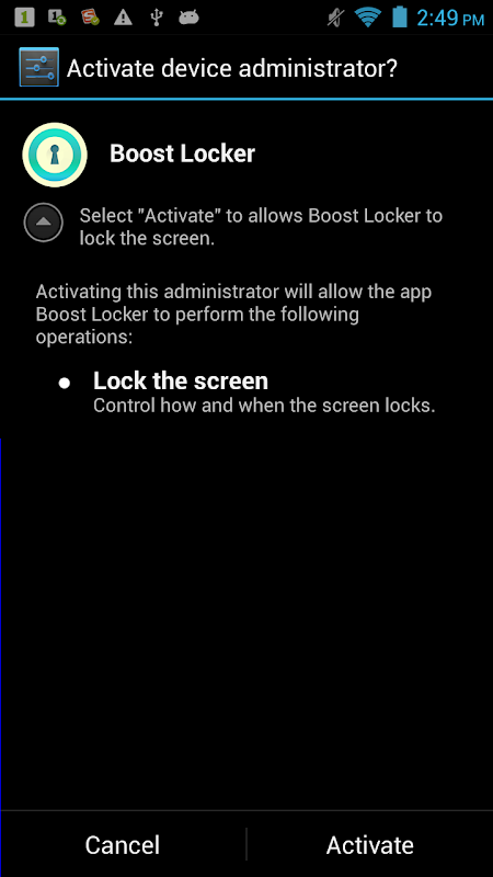 Uninstall: you have to go to "Settings—>Security—>Device administrators" to shut off Boost Locker first.