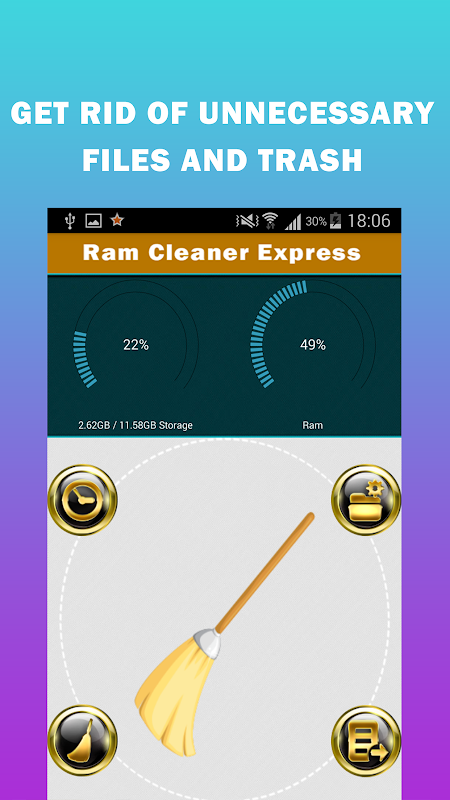 Our developer’s team made the best effort to provide an efficient memory cleaner app, assuring not just to delete the trashy temporal files, but to kill extra process and unneces-sary running applications; giving a root solution to the constant RAM overuse. Many ex-perts advice to boost the ram buying a new card with bigger capacity, but not us! The so-lution is to terminate the excess of processes and clearing as much space as possible to return to life that slow running phone. Our app constantly monitors your device, remove junk to help you reclaim the factory performance of your tablet or Android. Erase browsing history to clear extra unwanted information. Easy to use, and with a fast running access that can be used as a starter widget; this app will make your life easier and will improve the performance or all your devices!