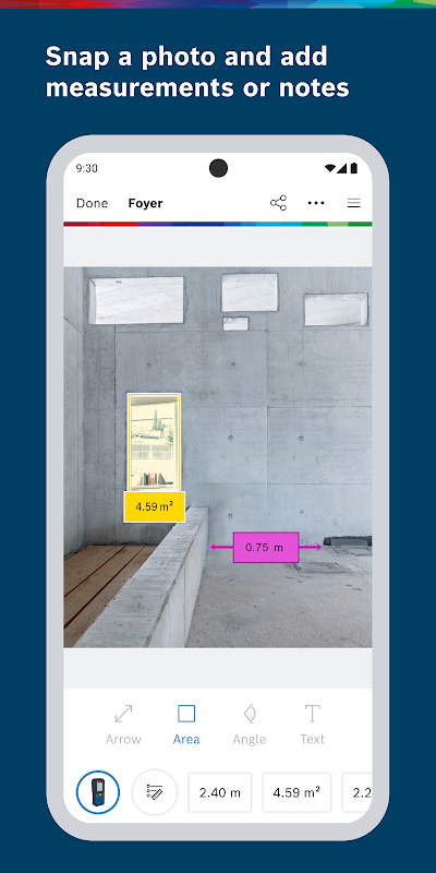Tüm bilgileri tek bir yere kaydedin: Bosch MeasureOn by Bosch Measuring Tools, kat planları, ölçümler, fotoğraflar ve notların yerinde kolay dokümantasyonu için uygulamanızdır.