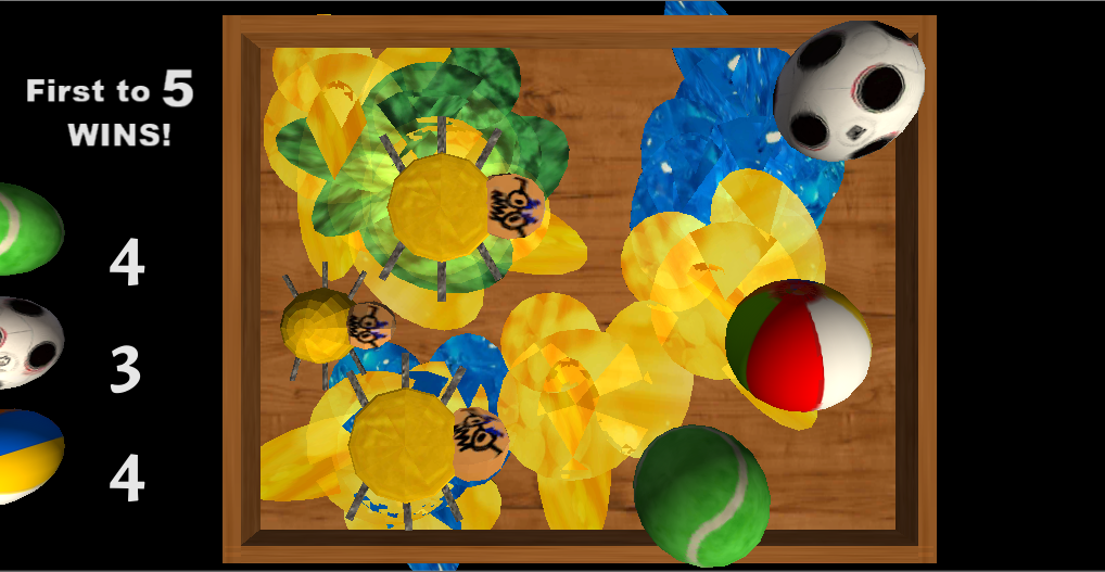 Beach ball, Soccer ball, and Tennis ball face-off in a contest to see who can be the first to squish silly bugs.