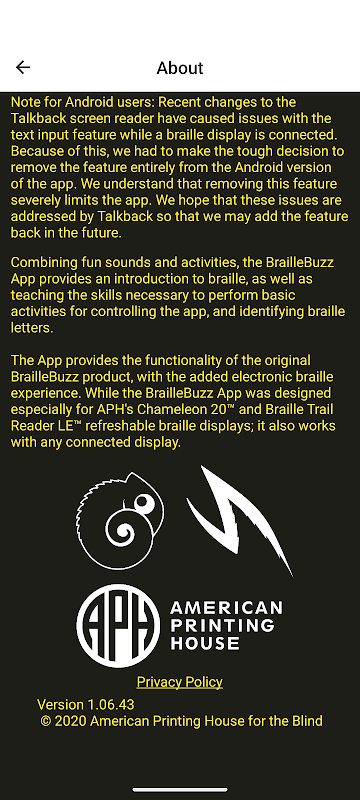 Uygulama, orijinal Braille Buzz ürününün işlevselliğini, eklenen elektronik braille deneyimiyle birlikte sunuyor. Braille Buzz Uygulaması, özellikle APH'nin Chameleon 20™ ve Braille Trail Reader LE™ yenilenebilir braille ekranları için tasarlanmış olsa da; bağlı herhangi bir ekranla da çalışır.