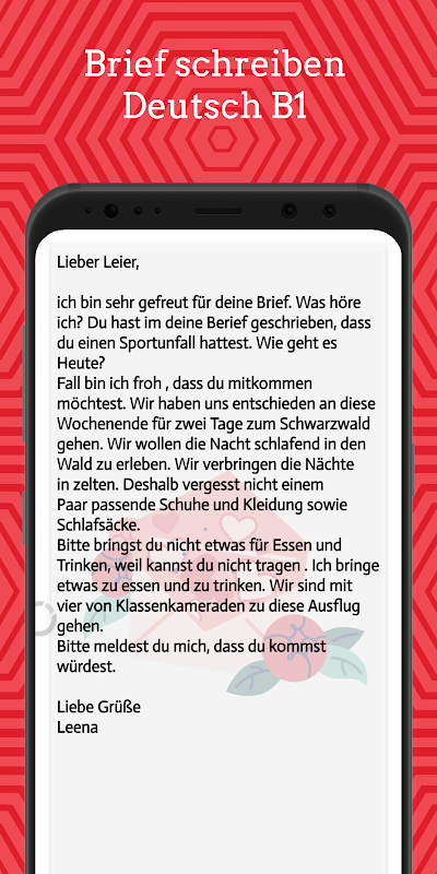 Bu uygulamanın yardımıyla B1 sınavı için bir mektup yazmak çok kolay Brief schreiben Deutsch b1. Sınav için en güzel harf örnekleri adım adım verilmiştir. Kısa schreiben Deutsch b1 Deutsch kısa schreiben öğrenmek isteyen öğrenciler için benzersiz bir uygulama.