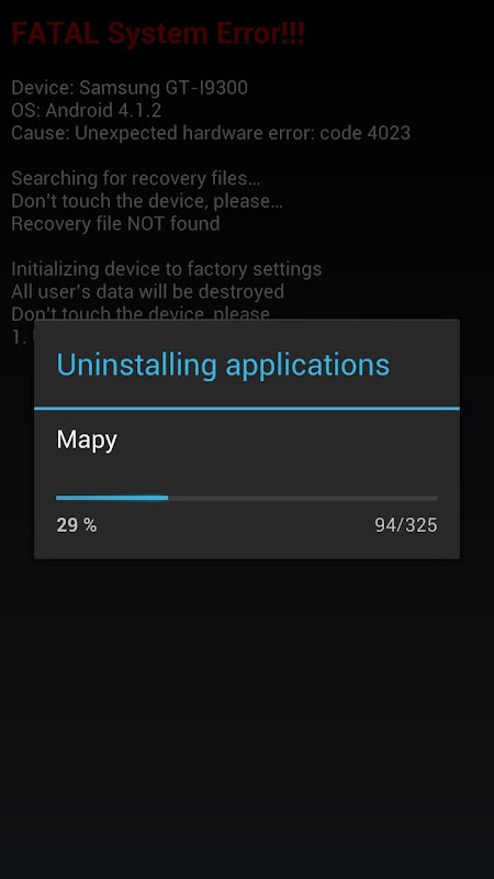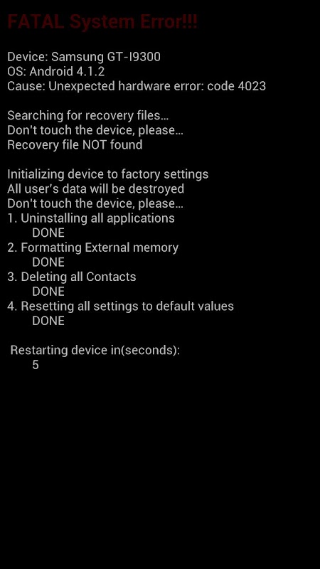 This app pranks people by simulating system failure followed by destroying all device’s data. But you don’t have to worry. It only shows the messages but doing absolutely nothing to your device.