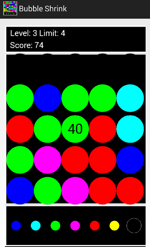 The next touched Bubble will change the color to this and Bubbles will shrink when the count of neighboured Bubbles with the same color is greater or equal to the limit. Changing the color of a Bubble costs a scorepoint.