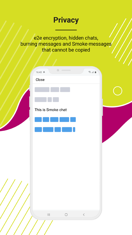 · Sending a variety of types of messages: voice, photo, video, text, smiles, gif, contacts, location, files, call recording...