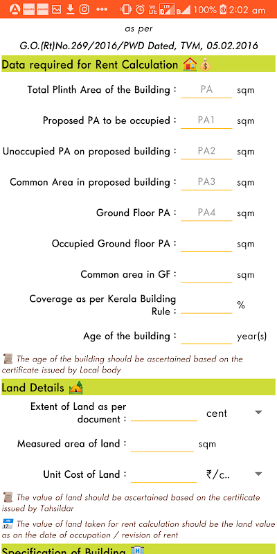 Kerala için Kira, Bina Değerlemesi ve daha bir binanın düzeltilmesi için bir hesap makinesi