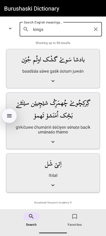 Uygulama, basit ve modern bir tasarımla Burushaski'yi erişilebilir kılar. Kullanıcılar şunlar arasında arama yapabilir: