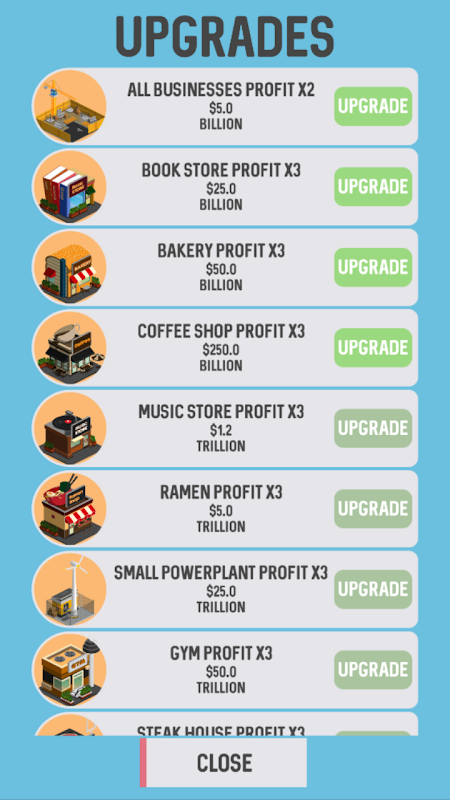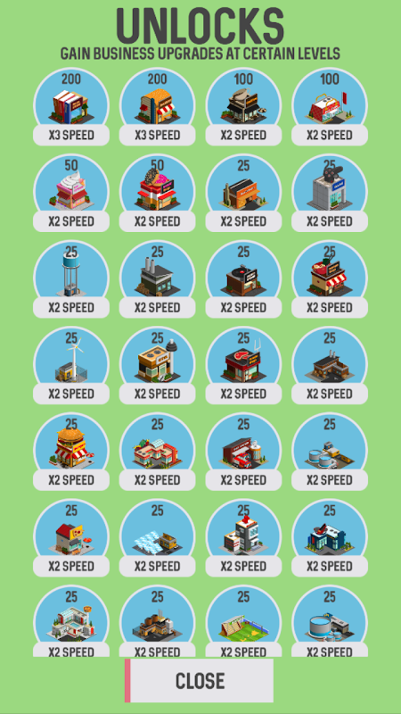 Business Tycoon, alttan (Küçük Kitap Mağazası) başlayıp 30'dan fazla farklı işletmeden gelen Milyonlarca Milyon Dolarlık bir Spor Merkezinin yüksekliğine ulaşmanızı sağlar!