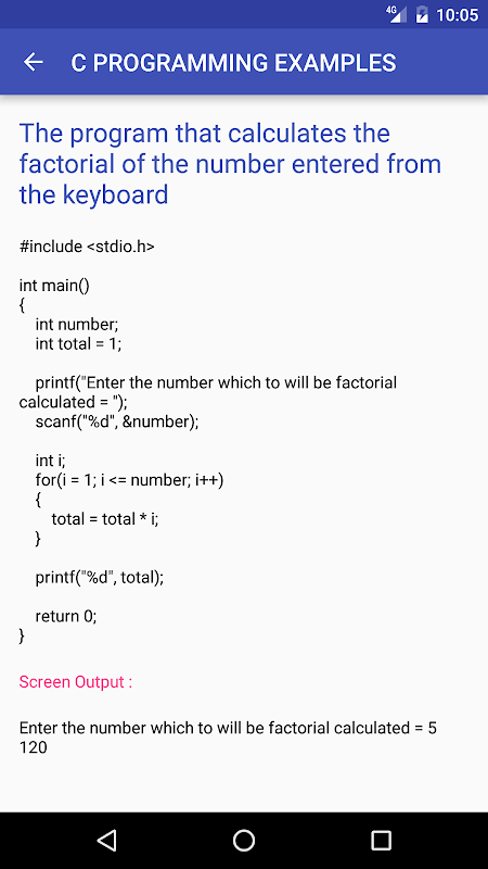 C PROGRAMMING SAMPLES is an application which is composed of C examples for those who are new to C language and those who want to improve themselves with examples. The application is separated by C subjects, many examples of each topic are available and this number will increase with new samples. Each sample screen output is absolutely available, you can experiment by yourself and check out the application from the screen. In practice, if you have a problem, wish, suggestion or something you see wrong, you can send an e-mail from "contact us" and an absolute return will be made. Application developers are university students, you can support by clicking on the ads. Optionally, the application will be developed for different software languages.