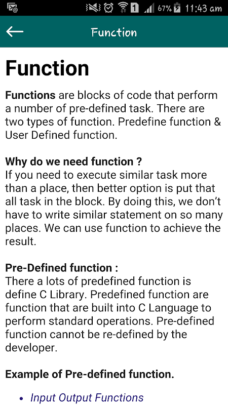 This Application have been design for all basic, intermediate learner. Or any developer one who is looking for to brush up his mind, they can also go through this App. Just a Quick learning phase of C programming languages.