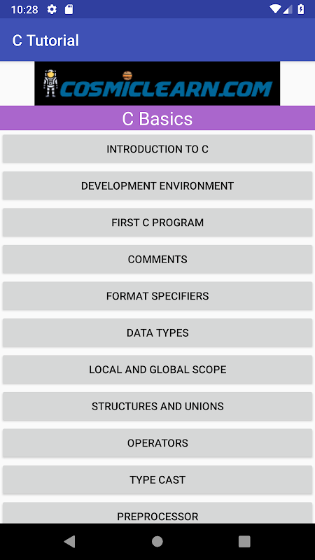 This App covers the following topics in C programming language.