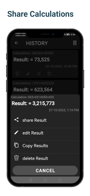 • Ekran alanına dokunarak hesaplanan sonucu panoya kopyaladı.