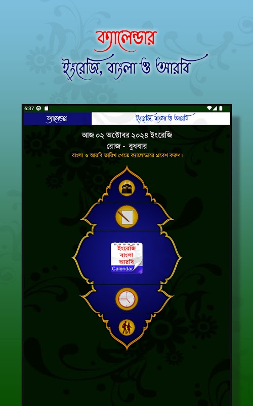 Bu takvim uygulaması Bengalce ve Arapça takvimin yanı sıra 2023'ten 2024 ve 2025'e kadar İngilizce takvimi içerir. Bangladeş'in resmi tatil günleri de burada verilmektedir. Cep telefonunuzda ayrı Bengalce takvim uygulaması ve Arapça takvim uygulaması tutmanıza gerek yok. Bu İngilizce takvimin içinde Bengali ve Arap takvimlerini bulacaksınız; ayrıca sürekli bir dua ve oruç programı, herhangi bir tarihte ihtiyacınız olan notları alma seçeneği ve nerede olursanız olun kıblenin yönünü belirleyen bir pusula bulacaksınız. Bangladeş'teyseniz hangi yönün batı olduğunu veya hangi yönün kıble olduğunu kolaylıkla bilebilirsiniz.