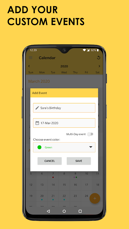 If you want a simple calendar app which just shows the dates and allows you to add your own custom events, then calendula is just for you!