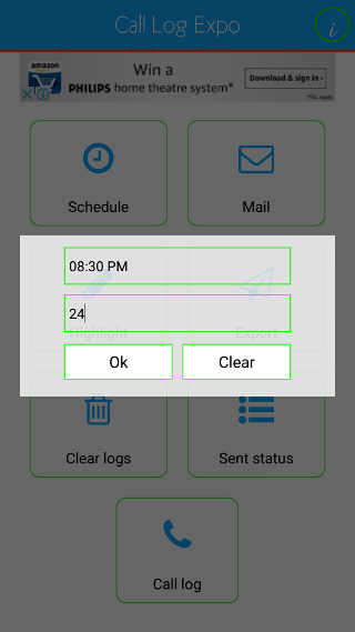 Sets the Alarm, the time it should run and the duration after which it should again run. So if the Alarm is set at 4:30 PM and the Expected Duration Hours is set at 24 Hours. The App runs everyday at 4:30 PM and sends the Call Log.