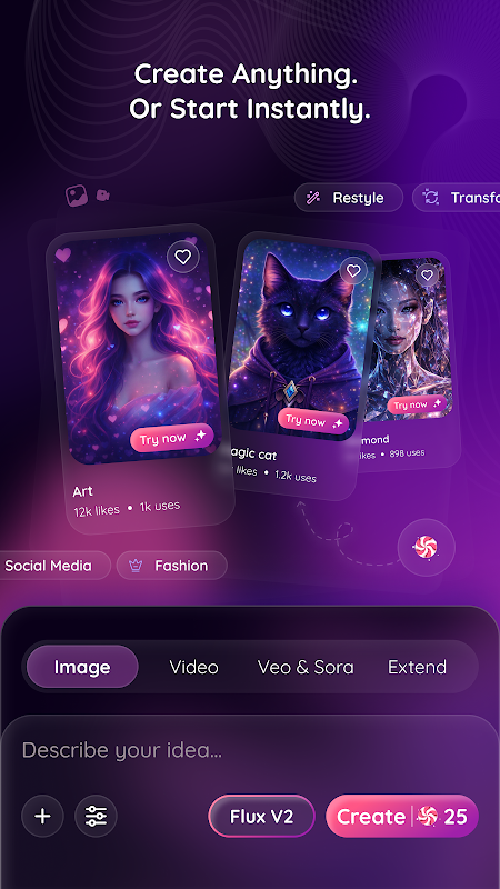 Sora, Veo 3, GPT Image ve daha fazlasını içeren son teknoloji modellerle desteklenen fotogerçekçi görüntüler ve yüksek çözünürlüklü videolar oluşturun. Zengin detay, sinematik kalite, profesyonel sonuçlar — kamera veya tasarım becerisi gerekmez. Çok çeşitli stiller arasından seçim yapın: fotogerçekçilik, anime, çizgi film, illüstrasyon ve daha fazlası.