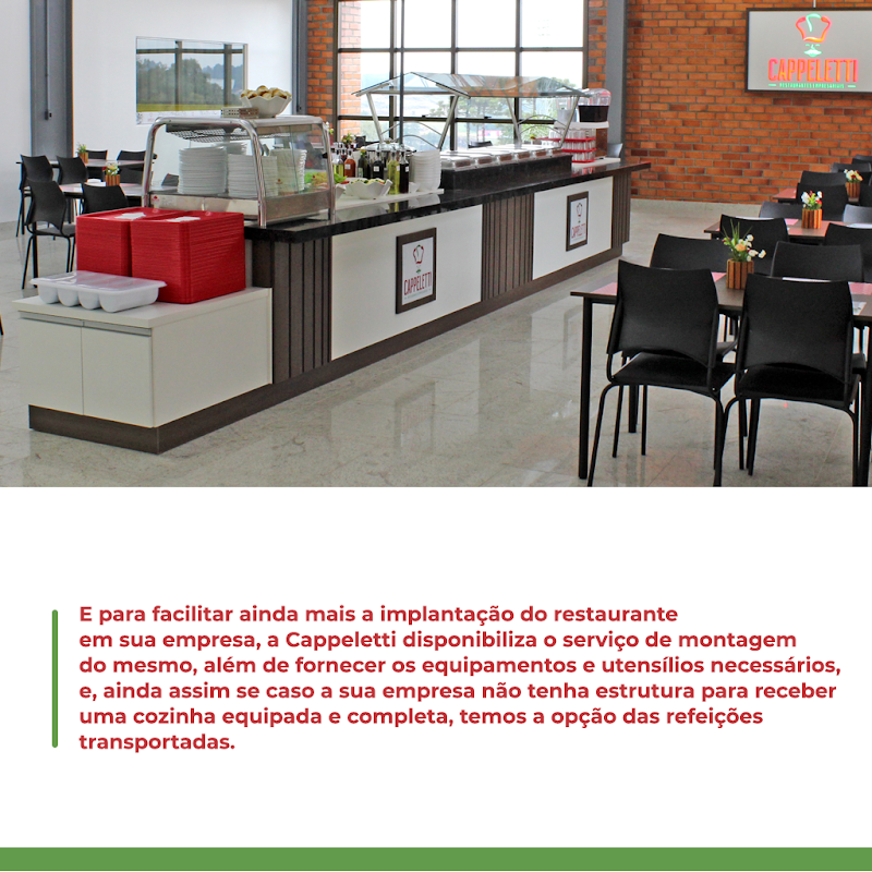 A Cappeletti Restaurantes Empresariais atua no ramo alimentício há mais de 10 anos, trazendo em seu DNA italiano a boa comida caseira, preparada com todo carinho e cuidado. Para a Cappeletti, servir os funcionários em empresas é bem mais que fornecer apenas uma alimentação, é fornecer variedade e qualidade em cardápios de alta qualidade. Para isso, conta com um serviço diferenciado, mantendo o contato direto com o cliente, sempre atendendo de forma personalizada e visando a sua satisfação.