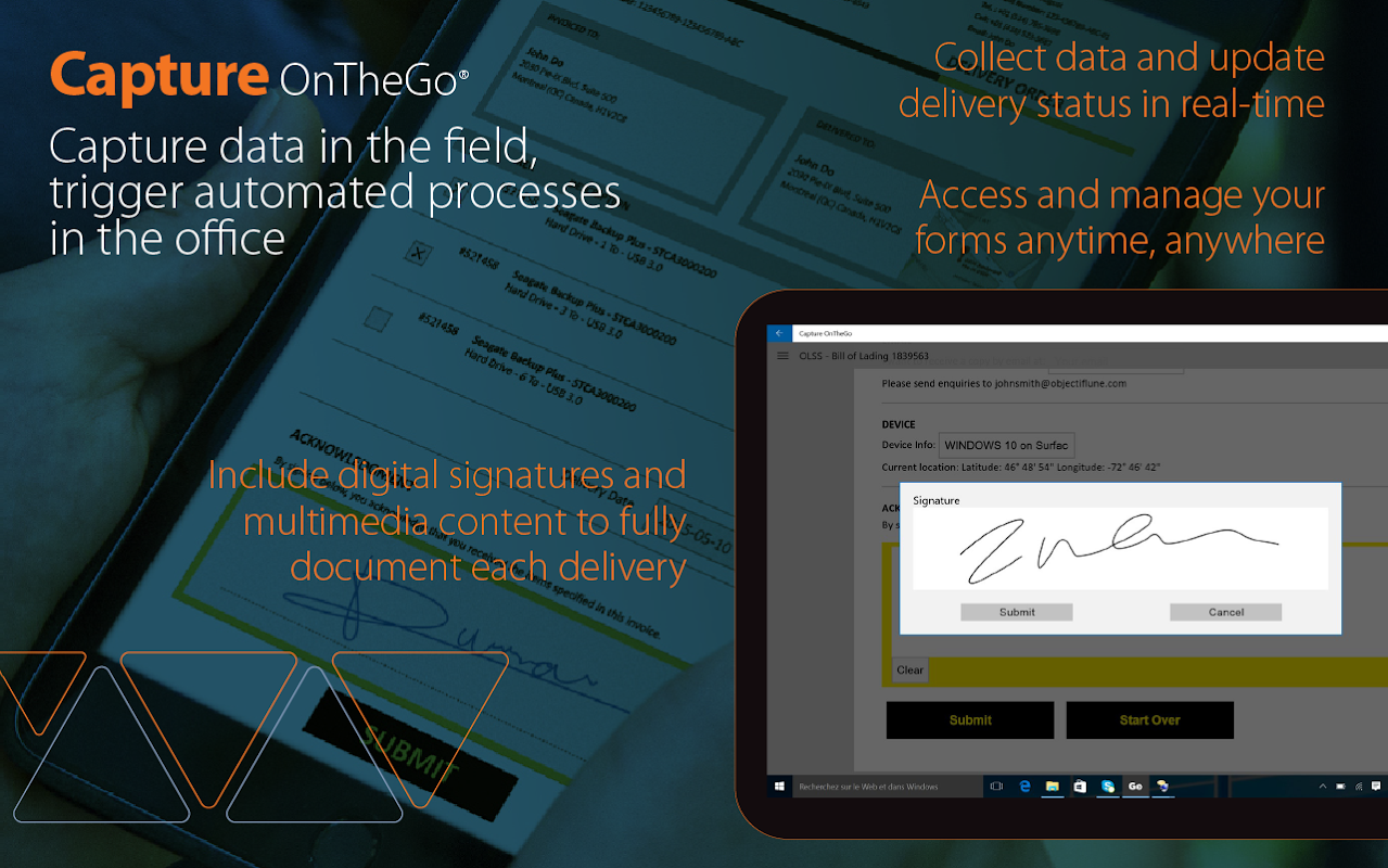 PlanetPress Bağlan yanında Yakalama OnTheGo mobil uygulaması çalışmaları uzak işlemleri yönetmek için daha iyi bir araç ile size sunmak. Vb satın alma siparişleri, teknik servis aramaları, denetimler, gibi kağıt iş süreçlerini alın ve dijital hız bunları hızlandırmak. Cihazınıza aktarılır interaktif HTML formları kullanarak, her yerden, düzenleme ve paylaşma dokümanlara erişebilir. Daha sonra belge iş akışlarını ve otomatik işlemeyi tetiklemek için ofise geri tamamlanan formlarını el yazısı, fotoğraf, coğrafi konum koordinatları (GPS) ve imzalar gibi verileri ekleyin.