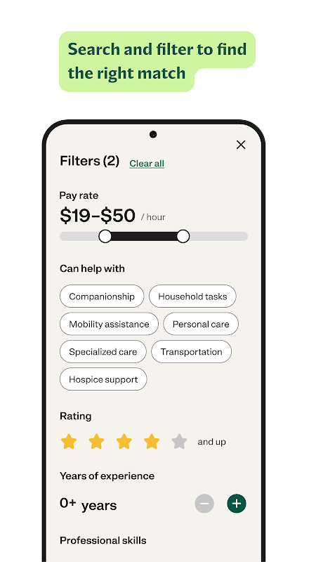 • Easily compare caregivers by experience, skills, hourly rate, ratings, and more