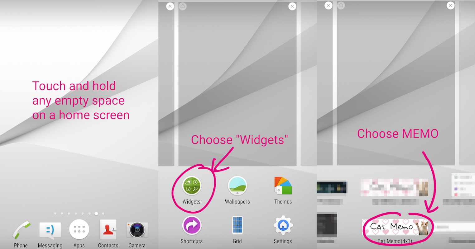 3. "Cat Memo" widget'ına dokunun ve basılı tutun. Her Ana ekranın resimlerini göreceksiniz.
