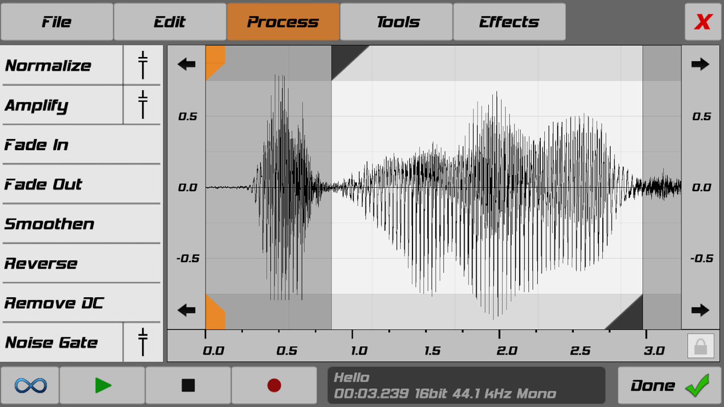 - Fade In / Out, Normale, Kuvvetlendirme ile Süreç dalga ses, operasyonlar ve daha Ters.