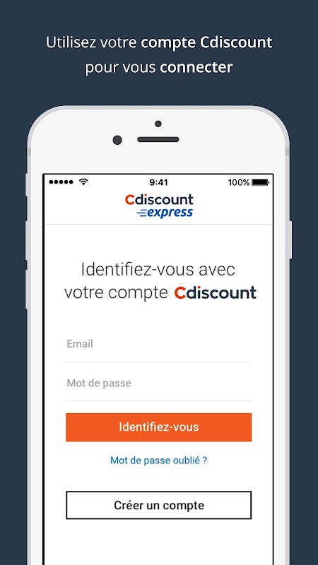 Pour vous inscrire, il vous suffit de créer un compte depuis l’application. Et si vous êtes déjà client Cdiscount vous pouvez vous connecter avec votre email et votre mot de passe habituels.