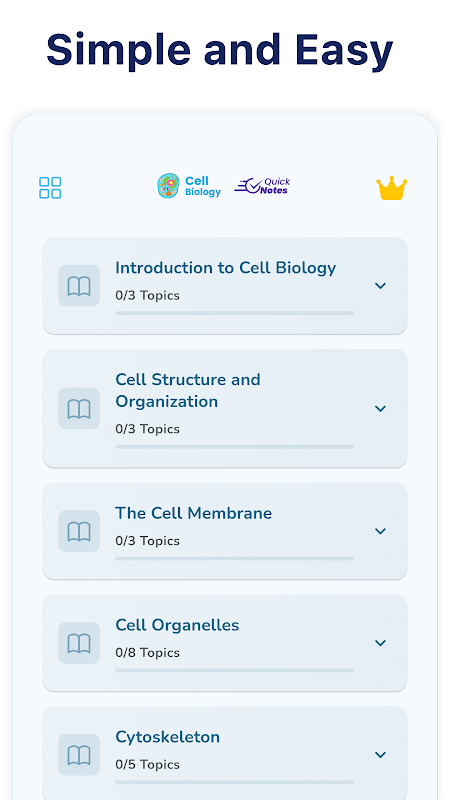 Hücre Biyolojisi - Ana Kavramlar, hücre biyolojisinin temellerini ve ileri kavramlarını anlamanız için eksiksiz bir rehberdir. İster öğrenci, ister eğitimci veya meraklı bir öğrenci olun, bu uygulama karmaşık hücre biyolojisi konularını kolay anlaşılır açıklamalar ve etkileşimli aktivitelerle basit ve ilgi çekici hale getirir.