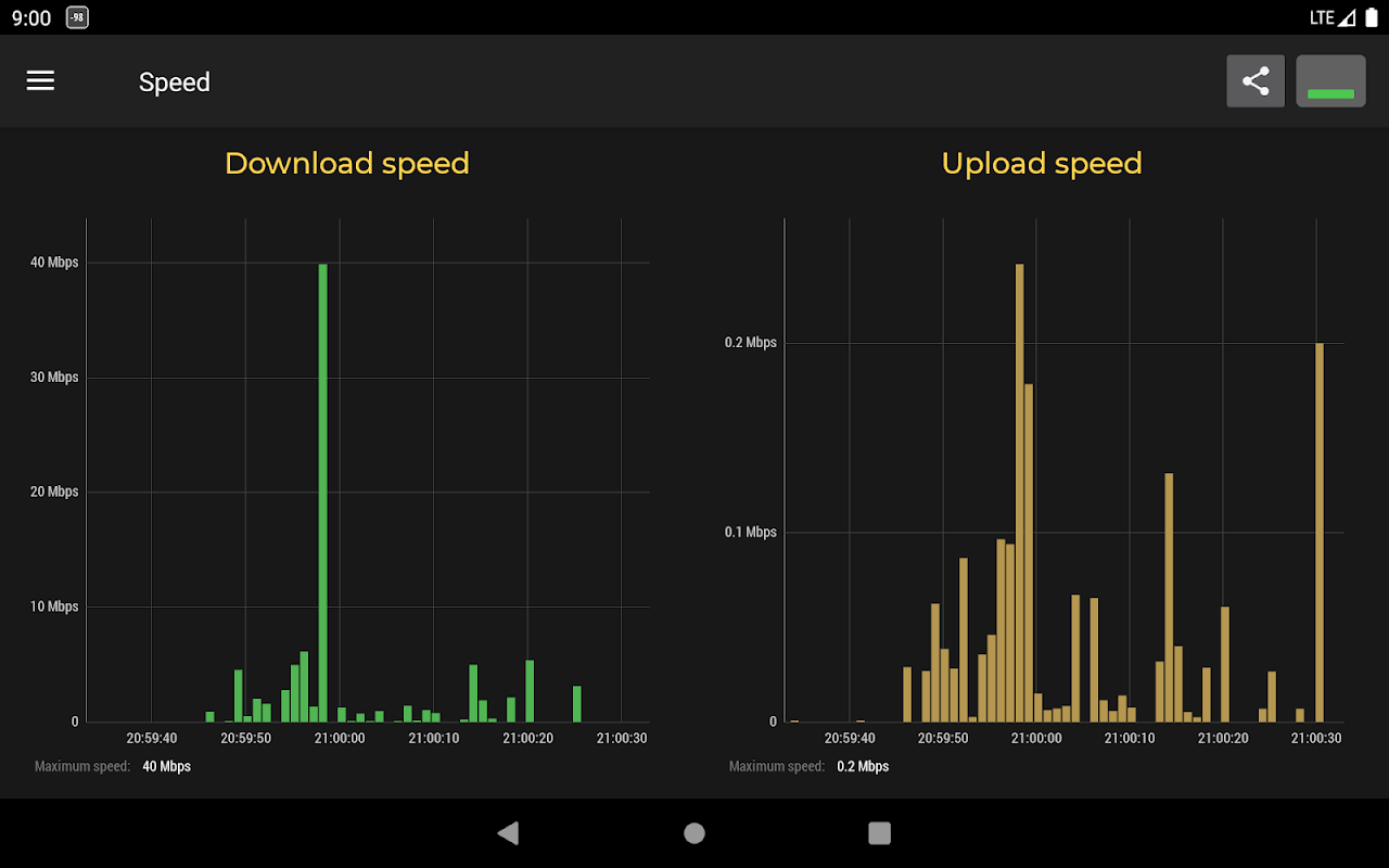 Grafikler mobil bağlantıdaki güç seviyesi değişimlerini ve hız dinamiklerini göstermektedir. Mobil cihaz tarafından kullanılan şebeke bilgilerine Log ve İstatistik görünümünde erişebilirsiniz.