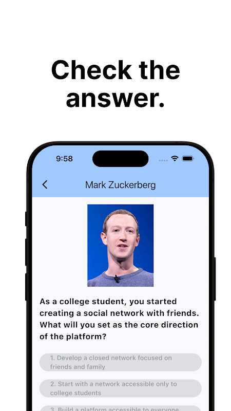 Bu uygulama, kullanıcıların ünlü CEO'ların yerine geçmelerine, testler aracılığıyla kararlarını deneyimlemelerine ve öğrenmelerine olanak tanır.
