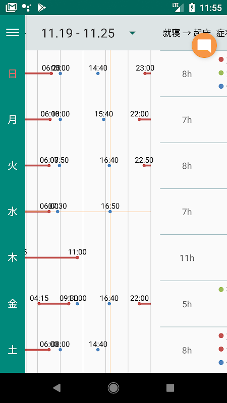 【記録】睡眠時間や症状の有無など、毎日の体調記録がつけられます。項目は自由に変更することができます。