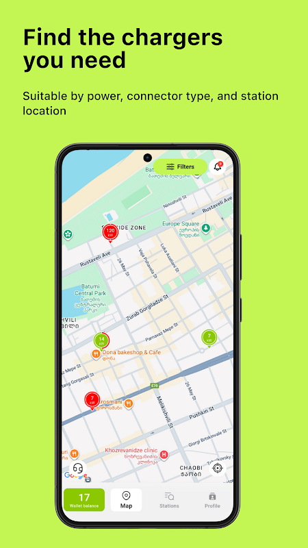 A mobile application for managing charging stations for electric vehicles in Georgia. Fast stations with CCS and GB\T connectors