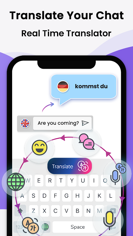 Bu sohbet tercümanı klavyesiyle, metni yazmak yerine doğrudan klavyeden istediğiniz dili seçin ve tercüme düğmesine dokunun; klavyede yazılan metniniz istediğiniz / seçtiğiniz dile çevrilecektir. Artık herhangi bir siteye çeviri için metin kopyalayıp yapıştırmanıza gerek yok. Farklı dilleri konuşan arkadaşlarınızla sohbet etmek için bu basit ama benzersiz Metin ve sohbet çevirmen klavyesini kullanın. Bu sohbet çevirmen klavyesi ile 100'den fazla farklı ülkenin dilini konuşan insanlarla konuşabilirsiniz.