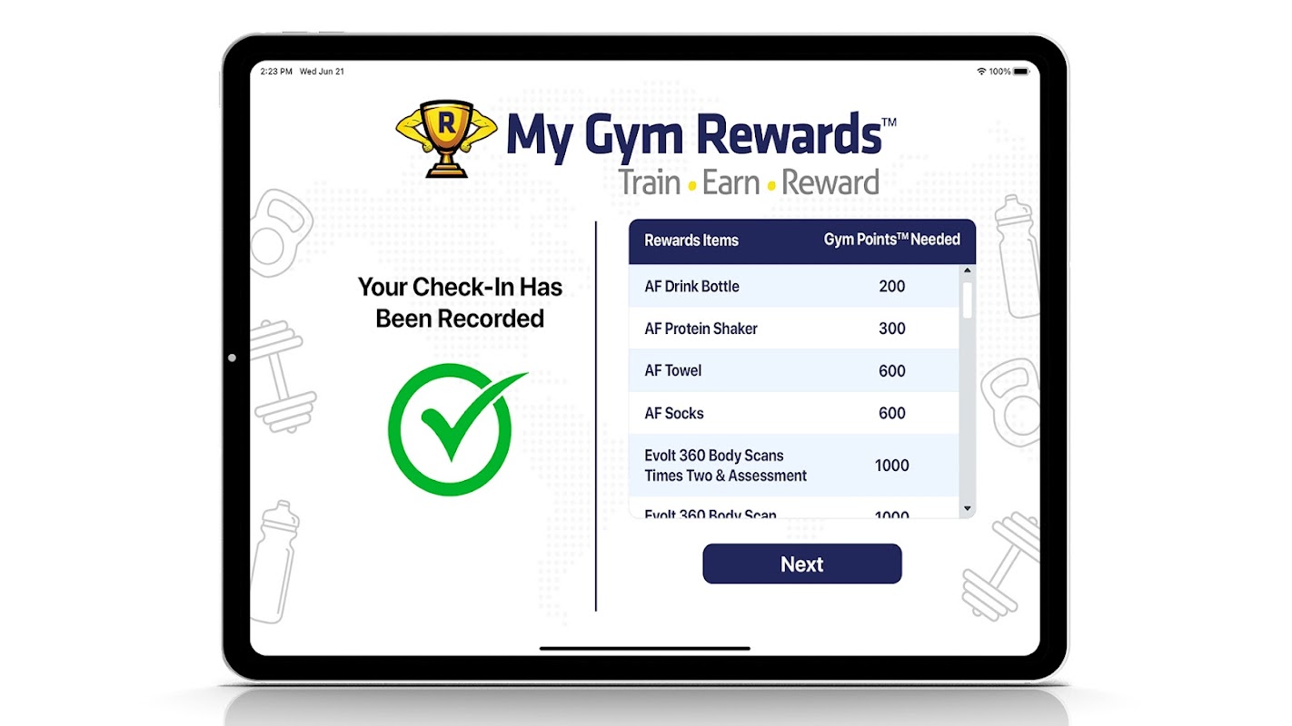 My Gym Rewards™ Check-In Uygulaması, My Gym Rewards™ Telefon Uygulaması kullanıcılarının, tesislerinde My Gym Rewards™ bağlılık ve ödül programının yürütüldüğü bir spor salonuna veya fitness tesisine girerken QR Kodlarını taramalarına olanak tanır. Bu tarama, üyenin Check-In Spor Salonu Puanı kazanmasına olanak tanır; Club check-in başına 10 puan. Üyeler birikmiş Gym Puanlarını daha sonra kulüp ürünleri, takviyeler, ücretsiz antrenman haftaları, ücretsiz kulüp içi kuponlar ve hatta aileleri ve arkadaşları için ücretsiz üyelikler (1 ay) gibi kulüp öğeleri ve hizmetleri (ödüller) için kullanabilirler.