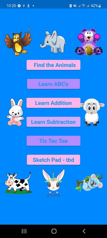 Karikatür hayvanlar, Alfabe, Toplama, Çıkarma, tic tac toe, Karalama.