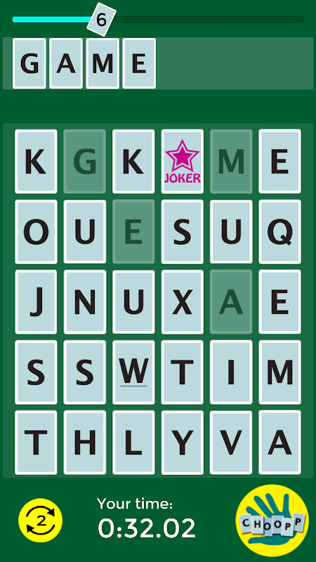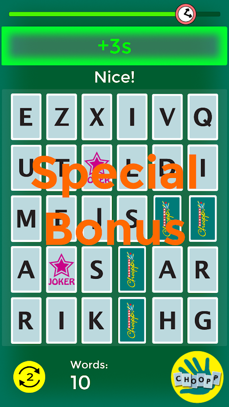 CHOOPP, zihninize ve tepkinize meydan okuyan, son derece bağımlılık yapan tek oyunculu bir kelime oyunudur. Harfler tamamen rastgeledir ve kelimeleri heceleme yeteneğinize ve hızınıza bağlıdır. Yazımınızı geliştirin ve kelime dağarcığınızı genişletin.