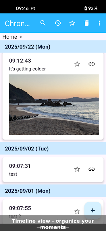 ChronoSnap, hızlı çekim yapmanıza ve daha sonra bağlanmanıza yardımcı olur. Çevrimdışı çalışır, verileri cihazda tutar ve hesap gerektirmez. **Kısa biçimli günlük kaydı (not başına 500 karaktere kadar)** için tasarlanmıştır, böylece hızlı ve tutarlı kalırsınız.